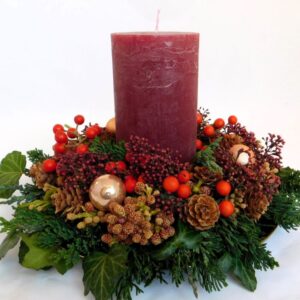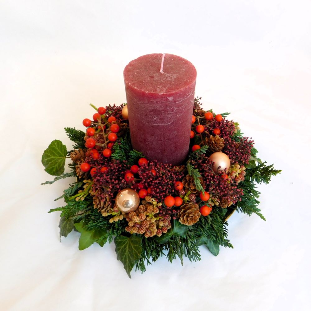 Ein hübsches handgefertigtes Kränzchen aus Koniferen, Skimmia, Kap-Grün und Zapfen arrangiert auf dem passenden Teller. Sie können mir die Farb-Vorlieben oder Ihren Wunsch ob mit oder ohne Kugeln mitteilen. Diesen werde ich, wenn immer möglich umsetzen. Somit ist jedes Kränzli ein Unikat.