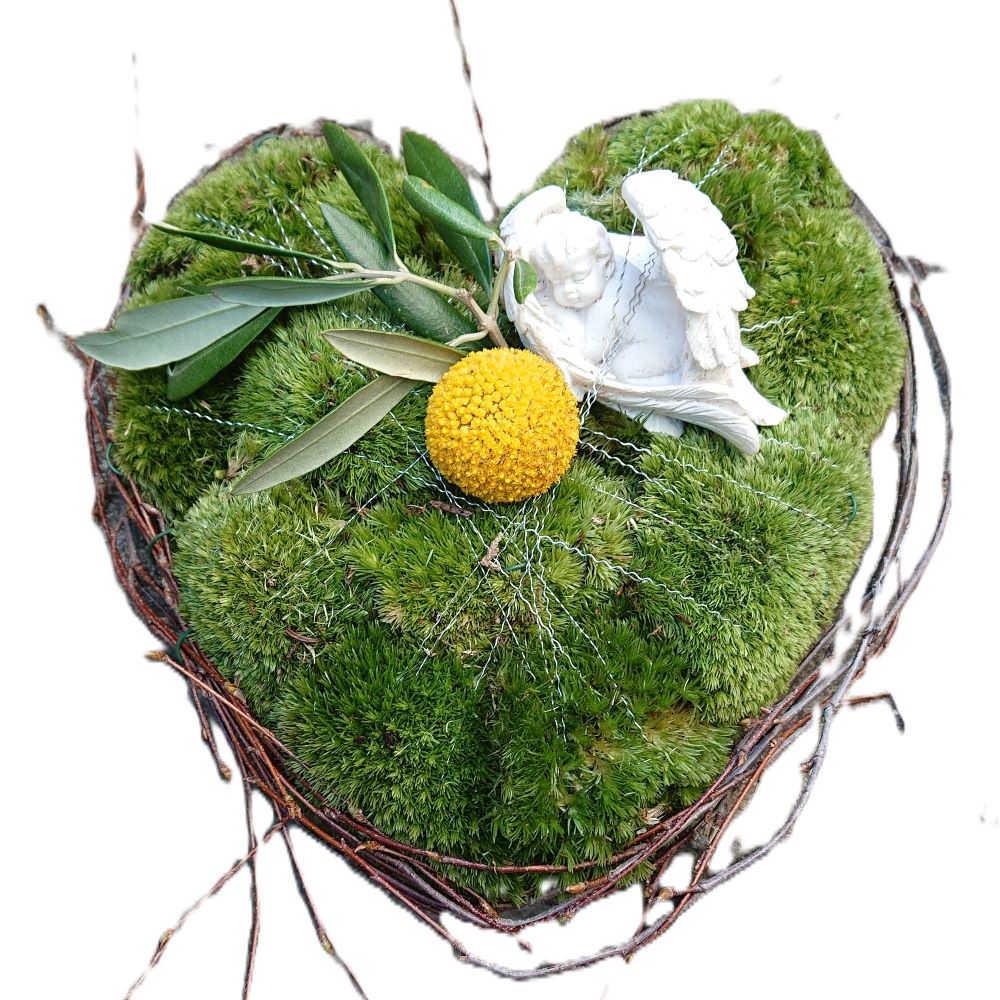 Schenken Sie Freude mit einem schönen Moos-Herz. Ein kleiner Engel und eine Blüte als Akzent sorgen für das gewisse Etwas. Ihre Wünsche werde ich, wenn immer möglich, umsetzen. Jedes Herz ist jedoch ein Unikat. Grösse ca. 22 cm