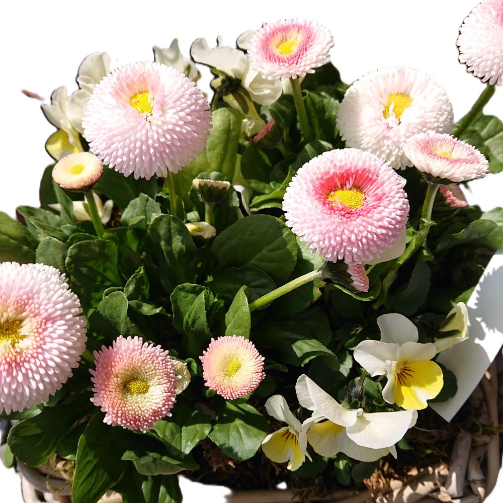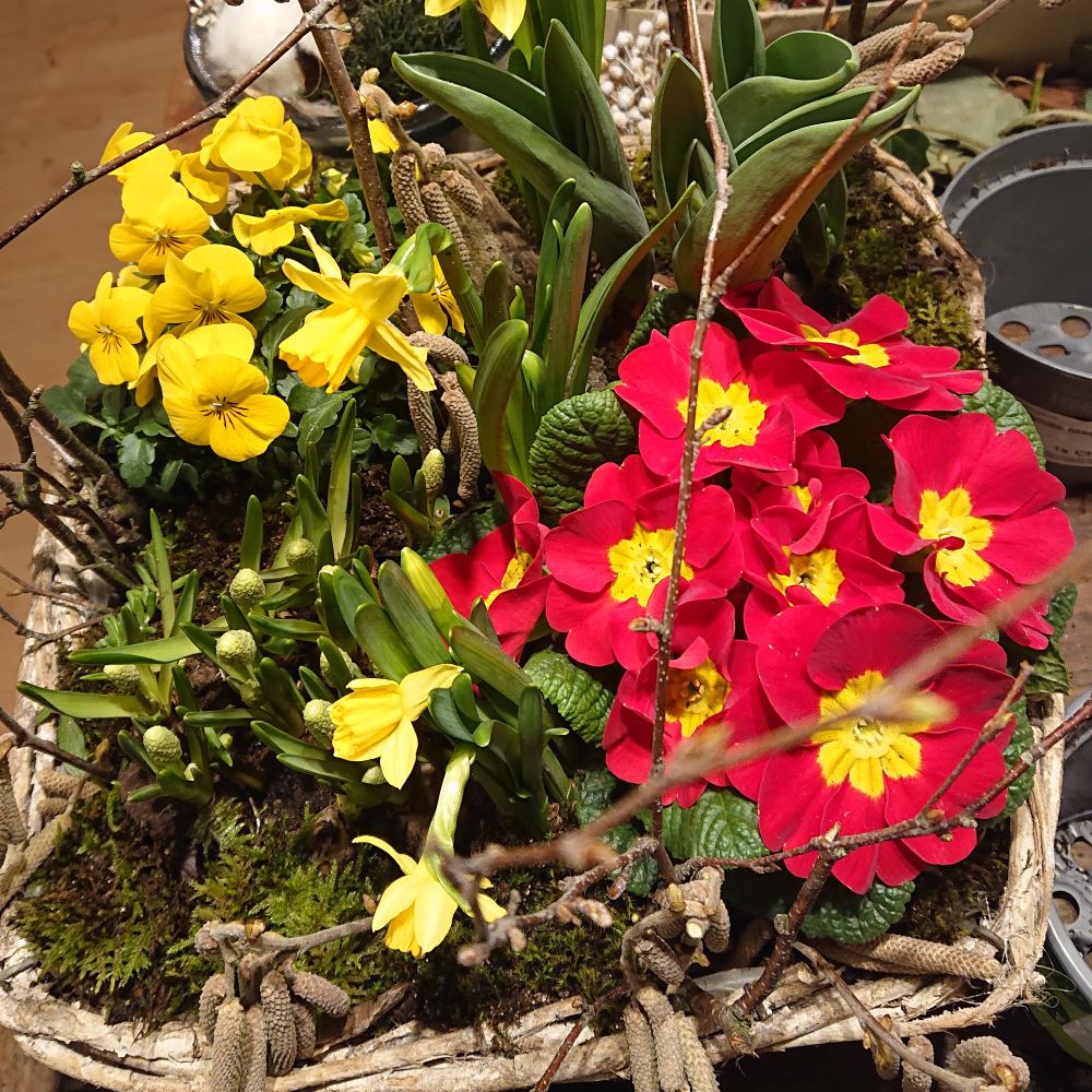 Auf den Bilder sehen Sie Körbe mit Frühlings-Pflanzen