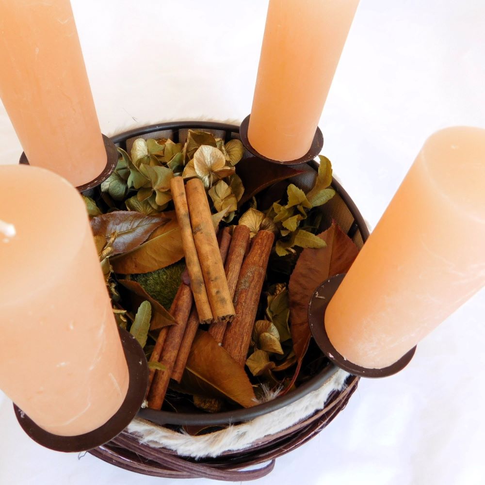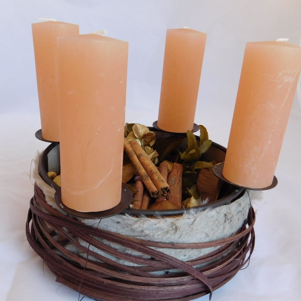 Sie erhalten den Adventkranz wie auf dem Bild. Die Naturmaterialien können Sie auch nächstes Jahr wieder verwenden oder nach Ihrem Geschmack das Gestell jedes Jahr neu befüllen.
