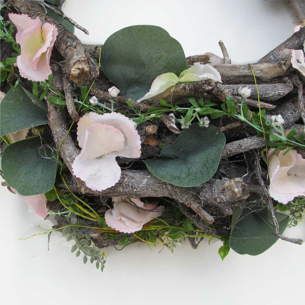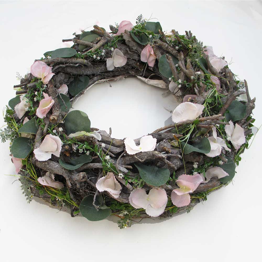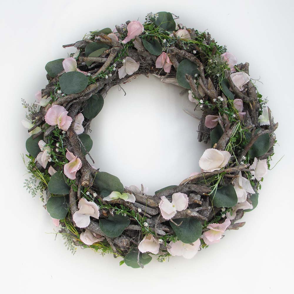 Ein tolles Deko-Objekt zum Legen oder Hängen. Mit langer Haltbarkeit. Der Kranz ist aus kräftigen, leicht geweissten Aststücken gearbeitet. Ich habe den Kranz mit Stoff-Blütenblättern, Stoff-Eukalyptus Blättern und einer Blumenranke ergänzt. Ein kräftiges Werkstück für lange Freude.