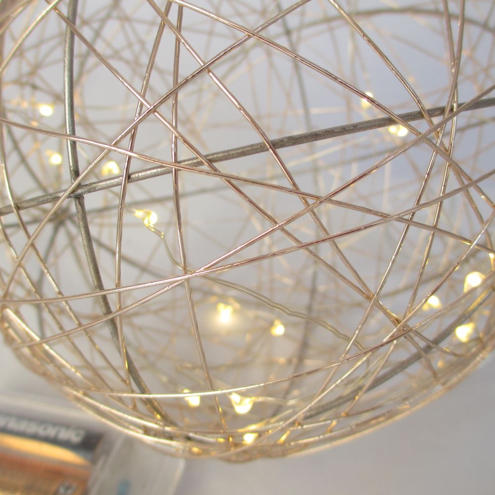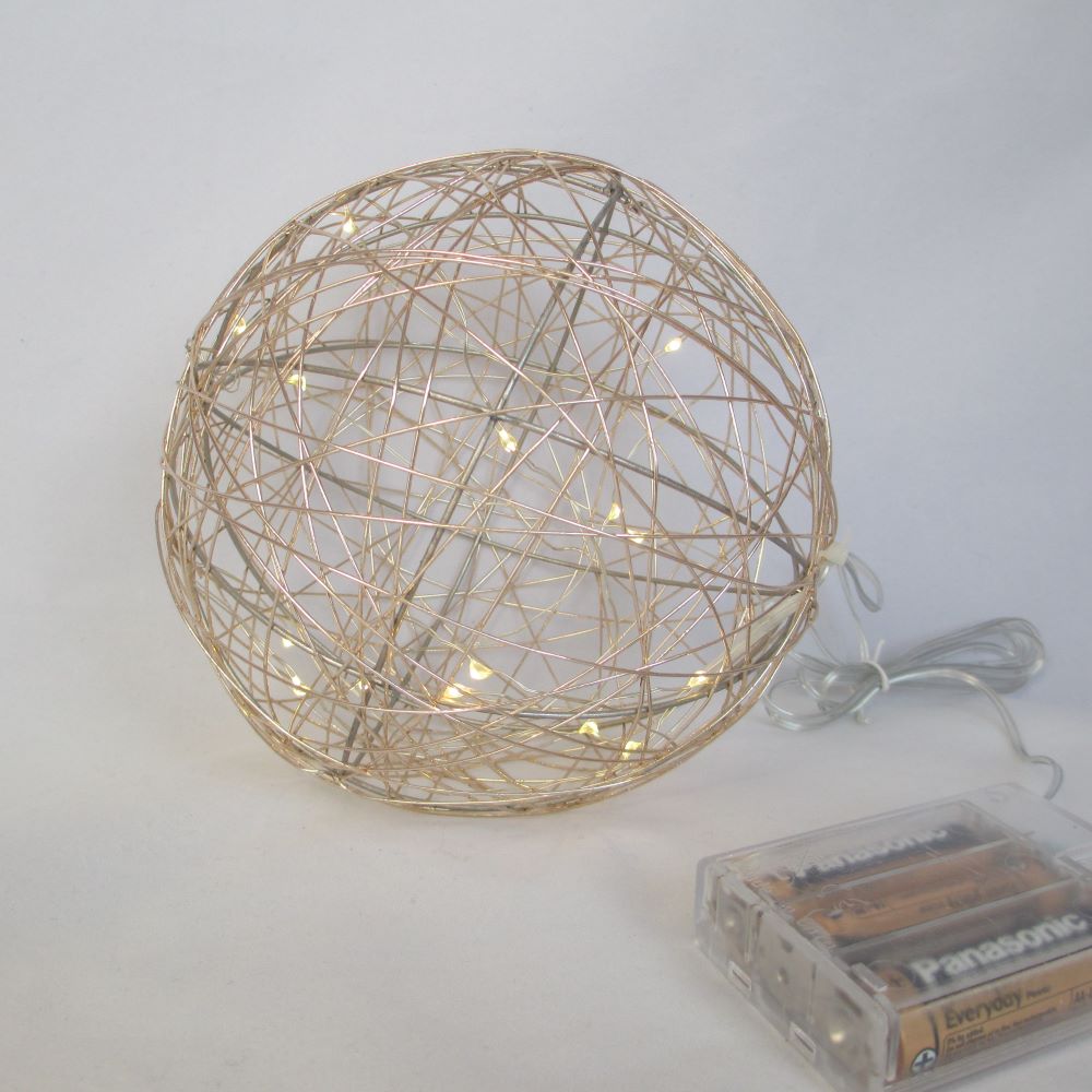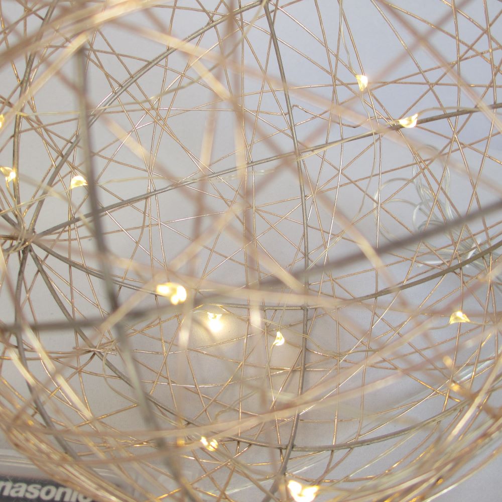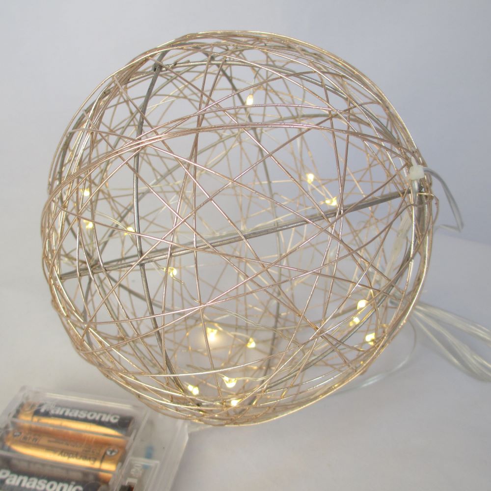 Diese schöne Kugel aus champagner farbenem Draht mit den zarten Leds zaubert einen hübschen Effekt. Sie benötigt 3 Batterien und ist für innen gedacht. Bei Benutzung im Freien den Batterienbehälter in ein Plastiksäckli einpacken, dann bleiben die Batterien schön trocken. das Kabel ist 110 cm und der Durchmesser der Kugel 15,5 cm