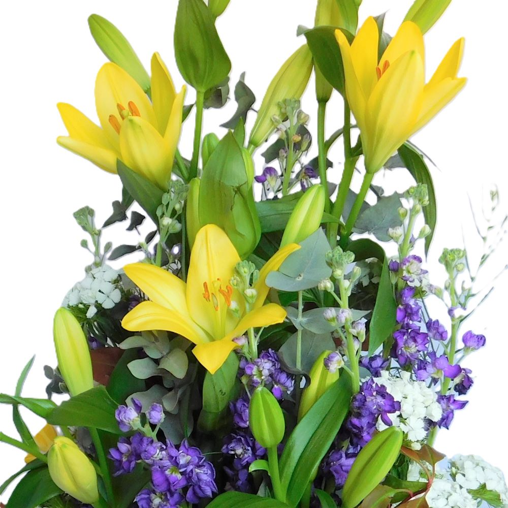 ein eher schlankes, höheres Blumen-Gesteck aus Schnittblumen. Auf Wunsch schreibe ich gerne den von Ihnen gewünschten Text auf das dazu passende Blatt, Band etc.