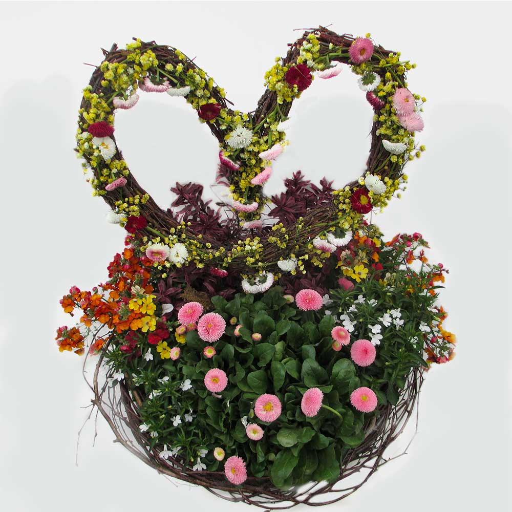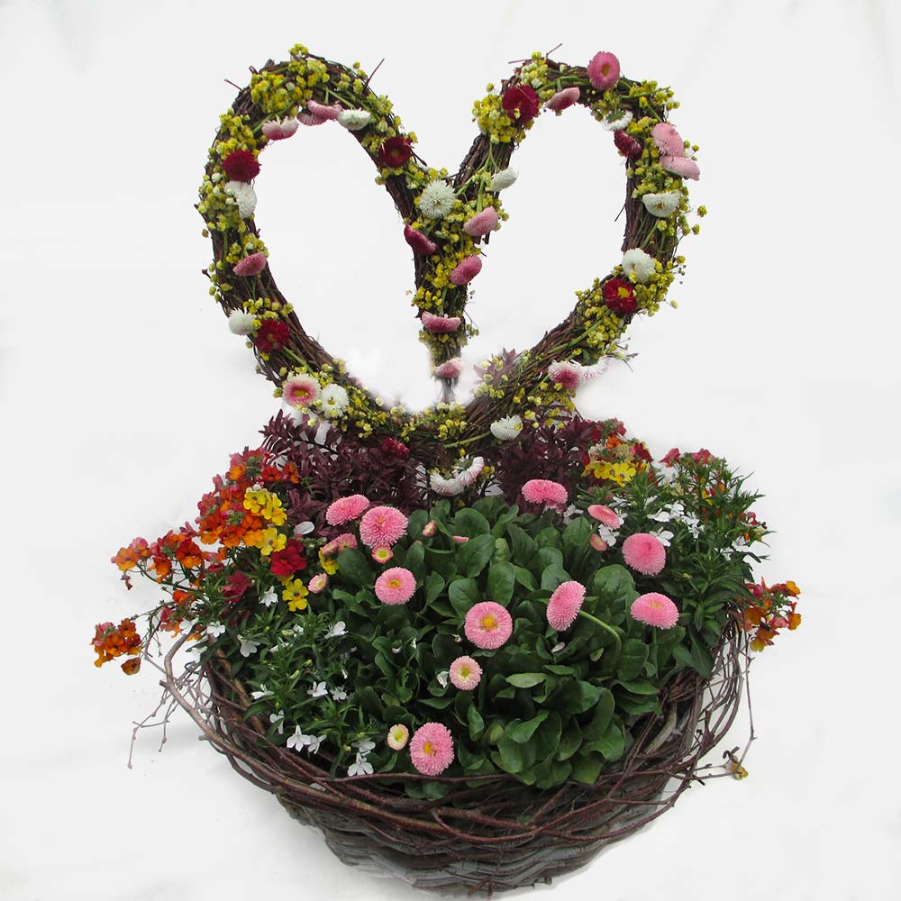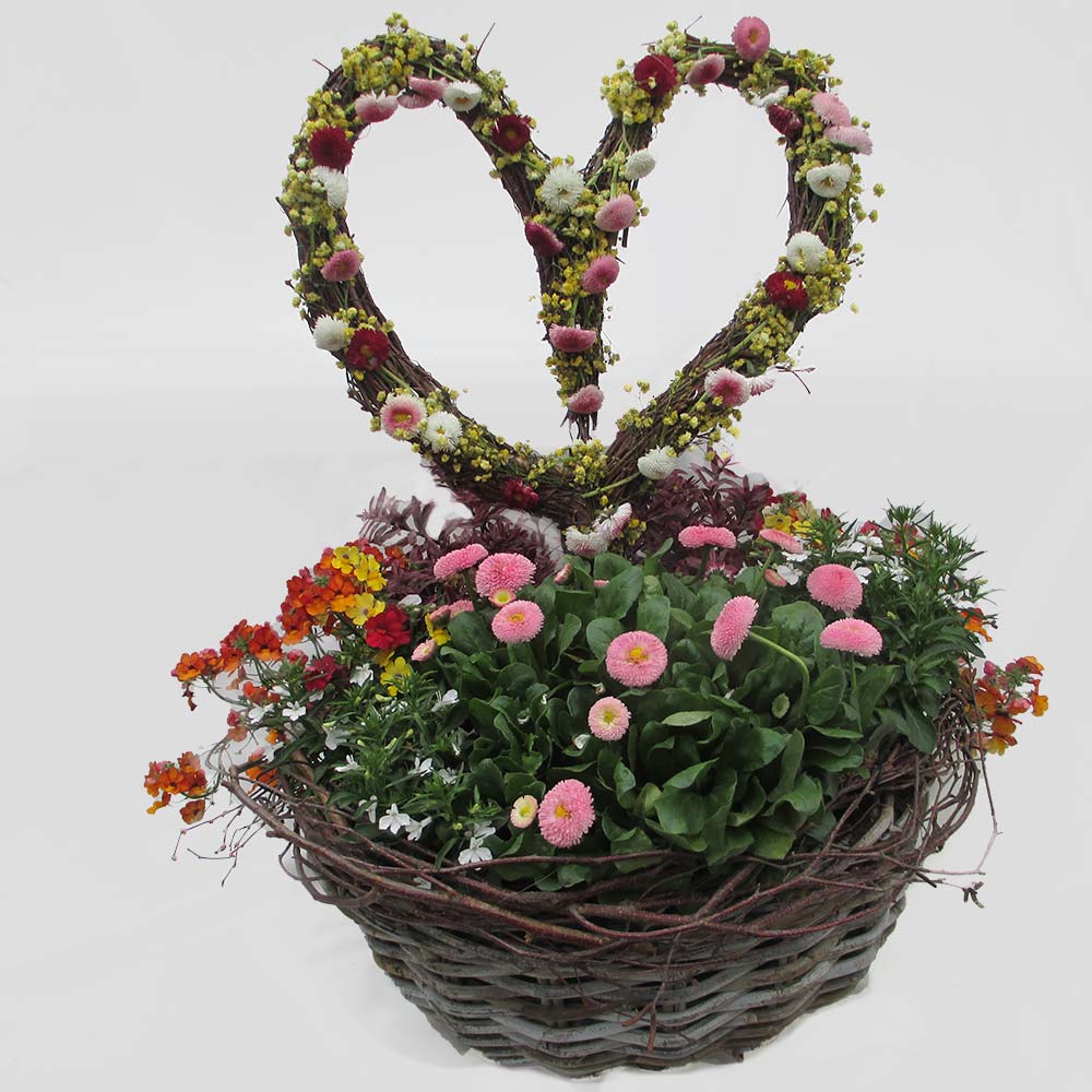 Der Korb bepflanzt mit saisonalen bunten Pflanzen ist für längere Zeit haltbar. Das Herz aus Zweigen mit zarten Blumen ergänzt gibt dieser Objekt das gewisse Etwas.